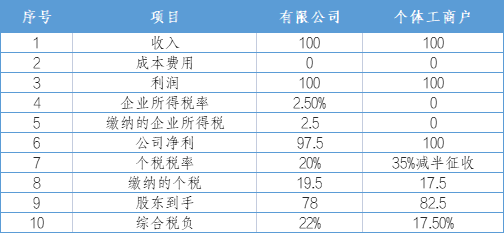而个体工商户只有一道个税,不用缴纳企业所得税,而且100万以下个税减半征收,我们对比一下。