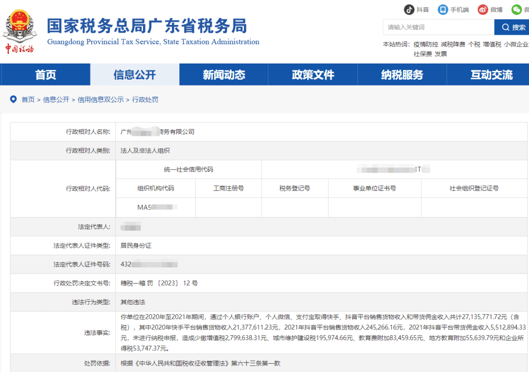 广州某电子商务有限公司在2020年至2021年期间,通过个人银行账户、个人微信、支付宝取得快手、抖音平台销售货物收入和带货佣金收入共计27,135,771.72元(含税),其中2020年快手平台销售货物收入21,377,611.23元,2021年抖音平台销售货物收入245,266.16元,2021年抖音平台带货佣金收入5,512,894.33元,未进行纳税申报,造成少缴增值税2,799,638.31元、城市维护建设税195,974.66元、教育费附加83,459.65元、地方教育附加55,639.79元和企业所得税53,747.37元。