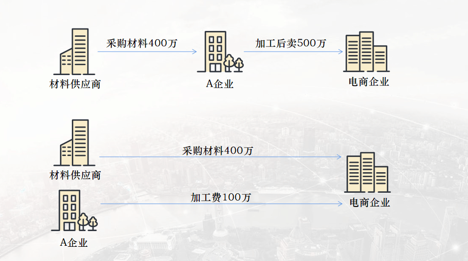 商业模式,指的是电商卖家与上下游企业之间的合作模式,一个好的商业模式,即可以实现双赢,又可以达到节税的效果。实务中,很多电商公司的供货商是小规模企业,为了享受更低的税率,不愿意增加销售额,否则超过限额就要强制转换为一般纳税人。即使进货能抵扣成本,但也没有原来的小规模税负低,自然不愿意配合。遇到这种情况可以采用委托加工的模式: